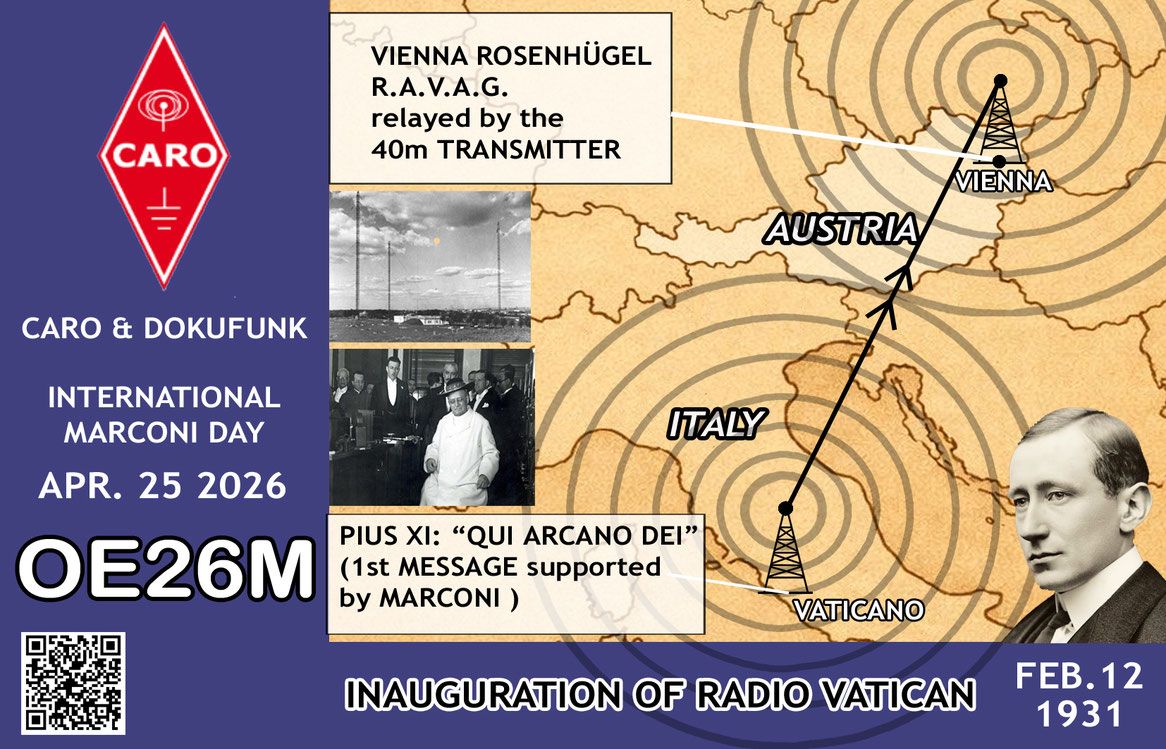 Die diesjährige QSL-Karte OE26M folgt nicht dem jahrzehntelangen Muster des Marconi-Konterfeis, sondern dokumentiert folgenden historischen Bezug zur Funkgeschichte Österreichs: Der ORF-Vorgänger RAVAG unterstützte 1931 die erste von Marconi initiierte Kurzwellen-Übertragung aus dem Vatikan. Die ersten übertragenen Worte von Pius XI lauteten „QUI ARCANO DEI“ – ein frühes Zeugnis der Leistungsfähigkeit der damals noch neuen und "geheimnisvollen" Kurzwellen-Technik.